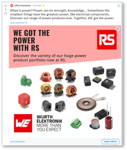 The Würth Elektronik 'WE got the Power' campaign promoted a range of power components at RS. The first fully-integrated campaign we built with WE, it incorporated a landing page, together with Google Display and Social campaigns.